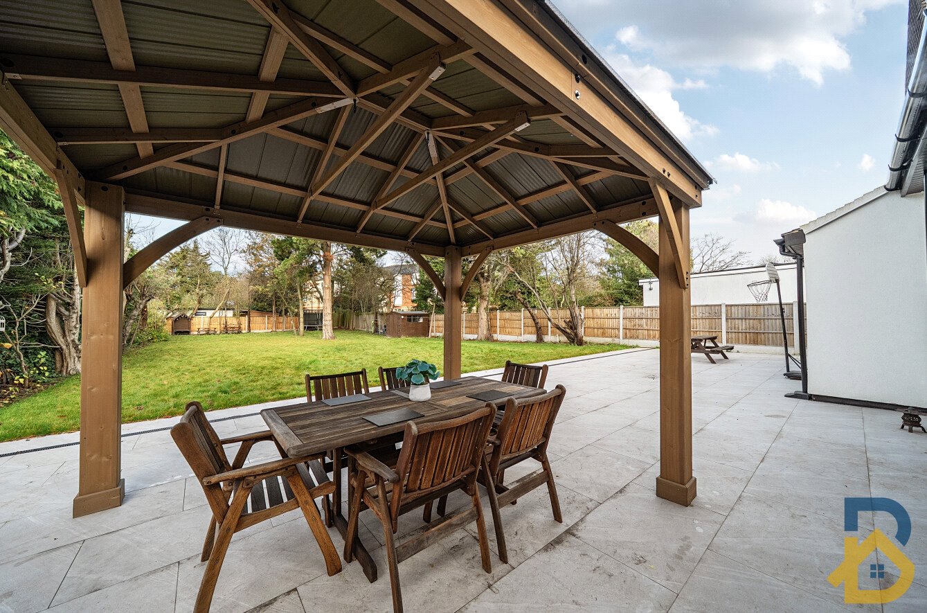 Outside, the south-facing garden is a major highlight. Measuring approximately 130ft, it offers a wide lawn, established trees, and an extensive patio area with a covered outdoor dining structure perfect for entertaining. The front driveway provides excellent parking for multiple vehicles.