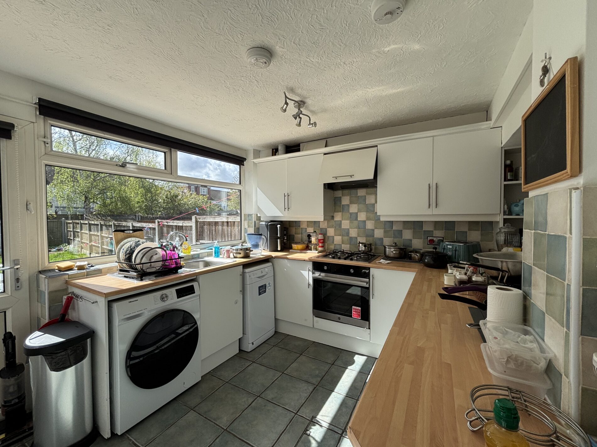 Spacious extended terraced home with three bedrooms, fitted kitchen, large living room, family bathroom, rear garden, and private driveway for two cars. Available early May.Details